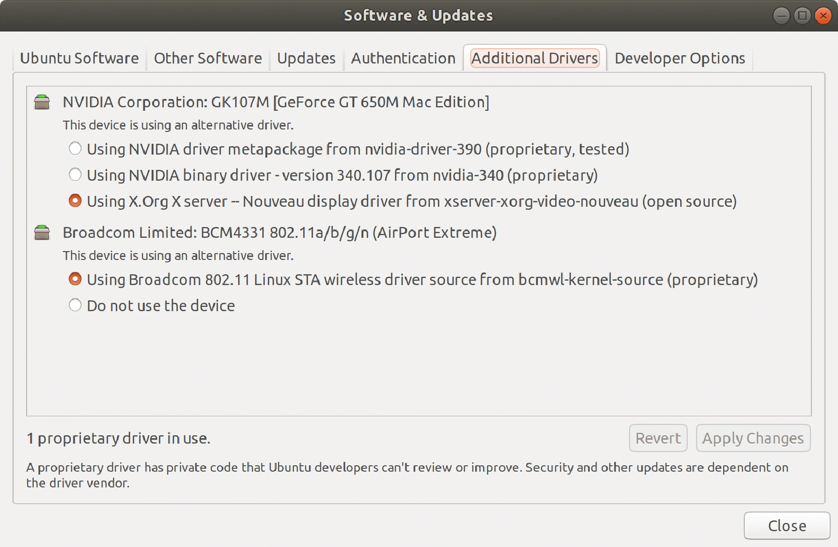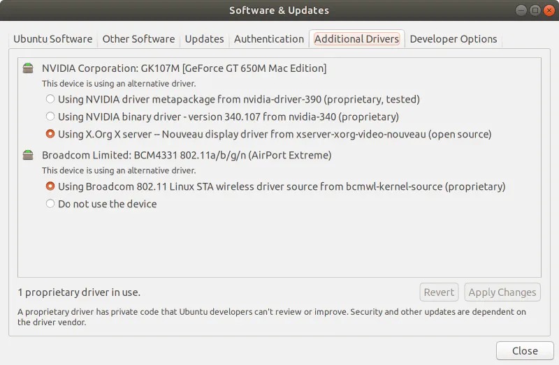 I’ve never had an Ubuntu with the working network drivers out of the box, even in the old RJ-45 times, so I wasn’t surprised that the system did not recognize my MacBook’s Wi-Fi module. Luckily for me, the Bluetooth module was recognized and worked pretty well, so I just tethered the Internet connection from my Android phone and that gave me enough bandwidth to allow the installer to fetch all the updates and drivers during the installation. Once I installed Ubuntu on my laptop, I just opened the “Software & Updates” app and clicked on the “Additional Drivers” tab. This screen displays all the driver options that are available for your laptop, and it allows you to pick the proprietary Broadcom driver that should allow you to use Wi-Fi.