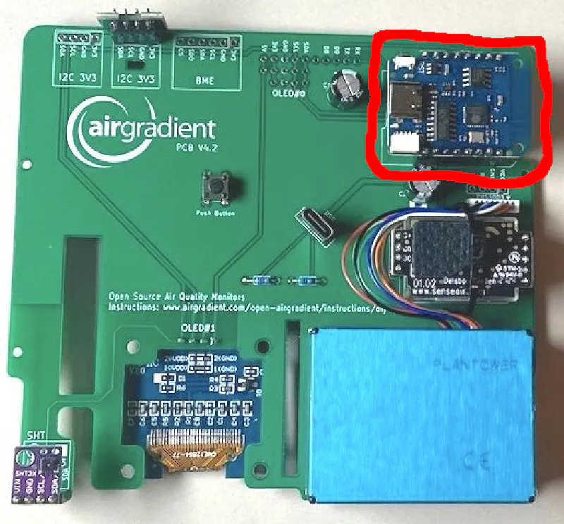 As you can see, the big AirGradient Pro board has a slot for a LOLIN D1 mini Espressif WiFi board. AirGradient Open Air uses a much smaller board with an SMT-mounted ESP32-C3-MINI-1 microcontroller: