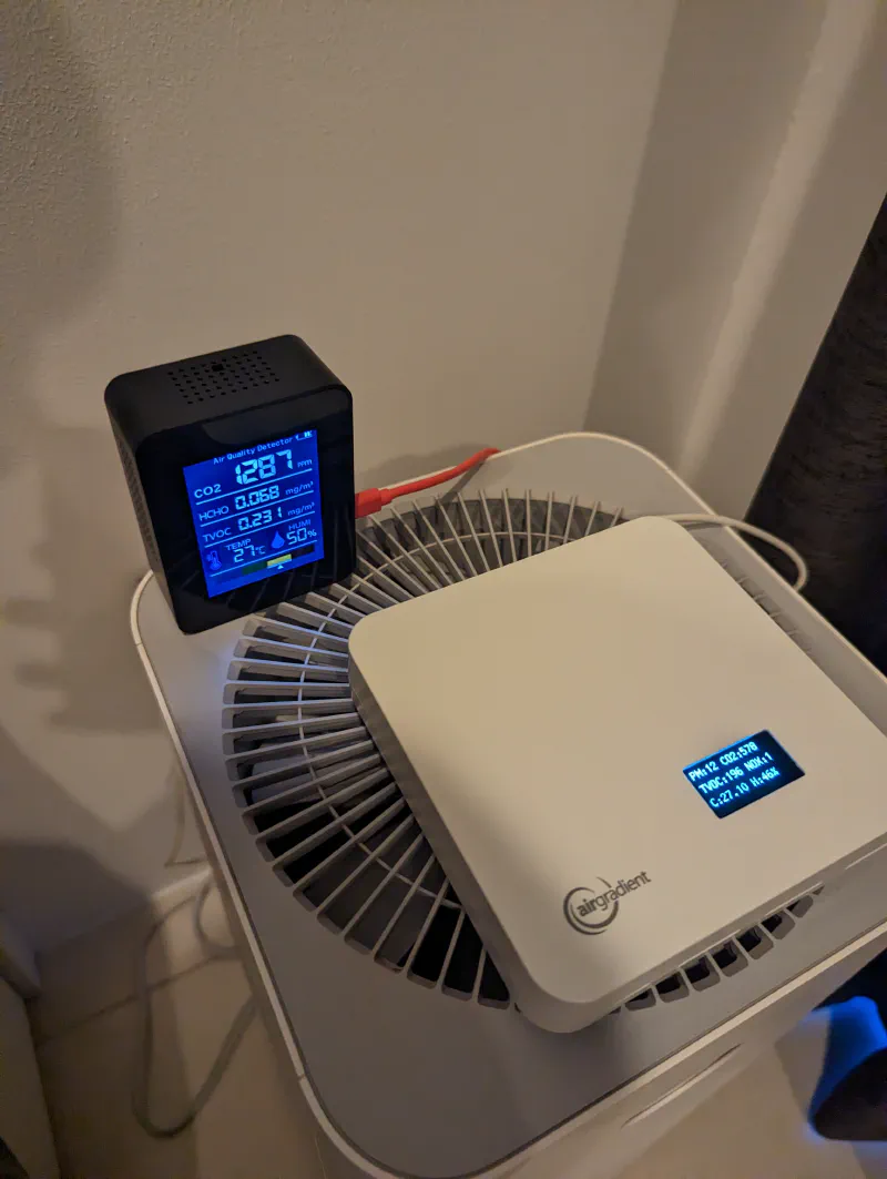I just stepped into a well-ventilated room before taking that photo, and the other sensor immediately jumped from ~400 to ~1,300 CO2 ppm, which is simply impossible. AirGradient numbers felt a bit off, too, since I expected ~450 ppm, but it’s known to show somewhat less accurate readings till it self-calibrates, which is happening automatically once a week. I checked the readings after the first self-calibration, and they were within the advertised +- 70 ppm precision.